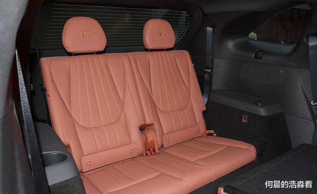 新车含6座与7座版,此次展示为7座,采用2+3+2布局,二排地板平整。前排扶手箱配冰箱,二排亦享冷暖冰箱。全车座椅头枕绣有“唐”字,彰显精致。